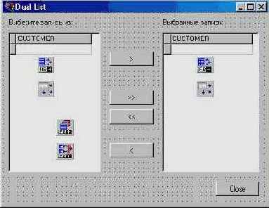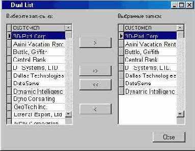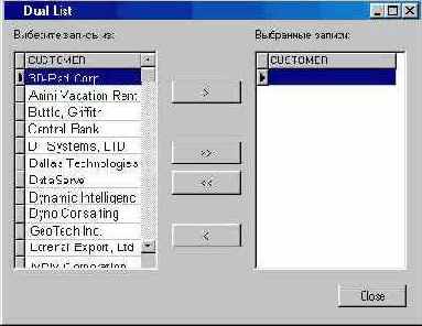 TpFIBDataSet включает несколько специальных методов для работы с внутренним буфером, в котором хранятся записи. В общем-то, данные методы превращают TpFIBDataSet в аналог TClientDataSet, ориентированный на InterBase. Наиболее интересным примером использования данных методов будет, пожалуй, построение диалога выбора, состоящего из двух списков (рис. 2.75).